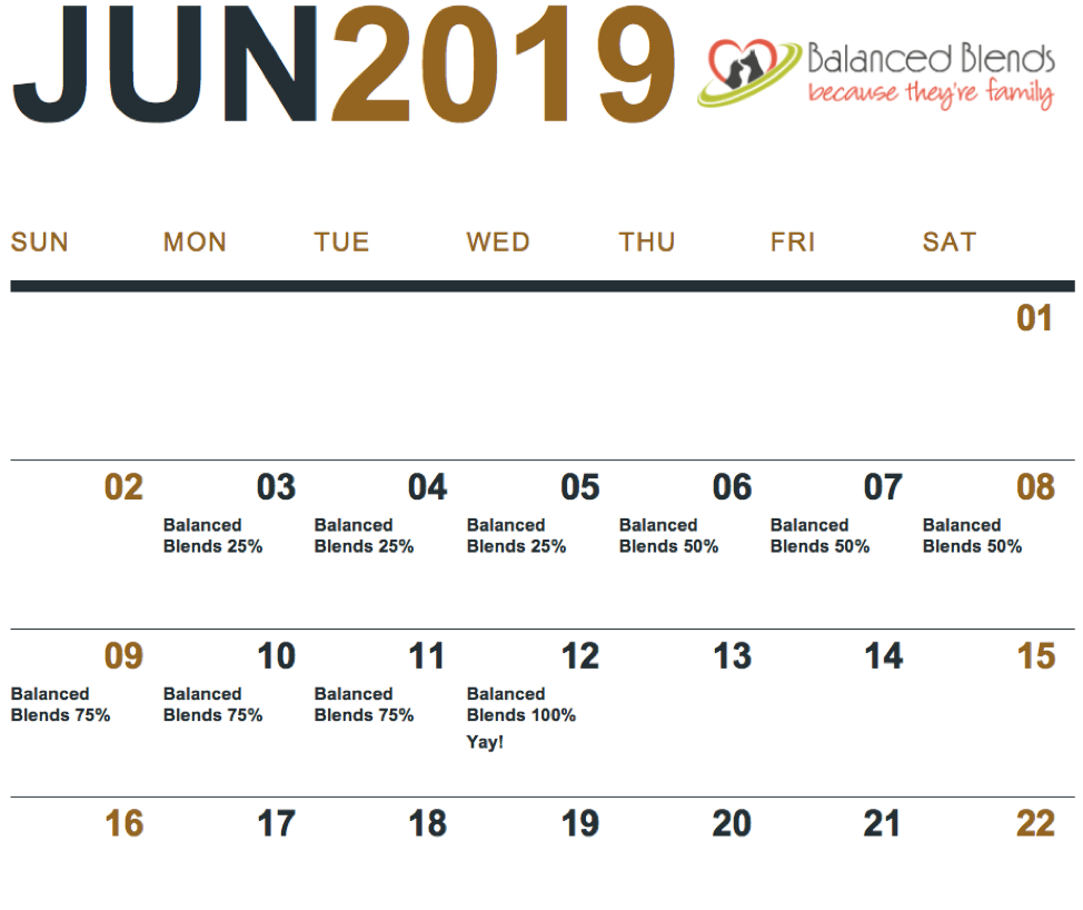 If you encounter the situation where they don’t accept the food after an increment, simply return to the previous one. For example, if they resist the switch to 50% Balanced Blends and 50% old food, simply repeat the previous 25% Balanced Blends quantity for an additional 3 – 4 days before trying 50% again. This extra time to accept the change may be all they require. You may also wish extend the transition times based on earlier experiences.